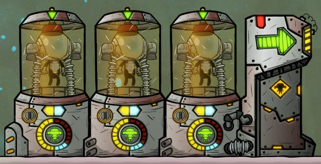 - Открыт: Назначение (Clearance: Vacancy) — при возвращении дубликанта, если все док-станции будут заняты, дубликанты не будут снимать ракетокостюм и не смогут пройти через этот КПП.